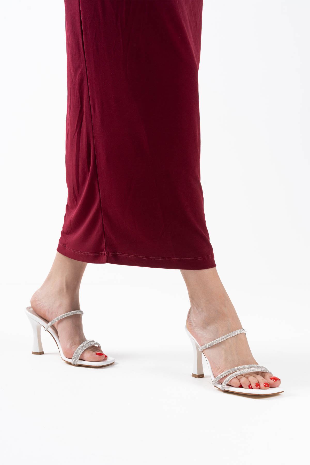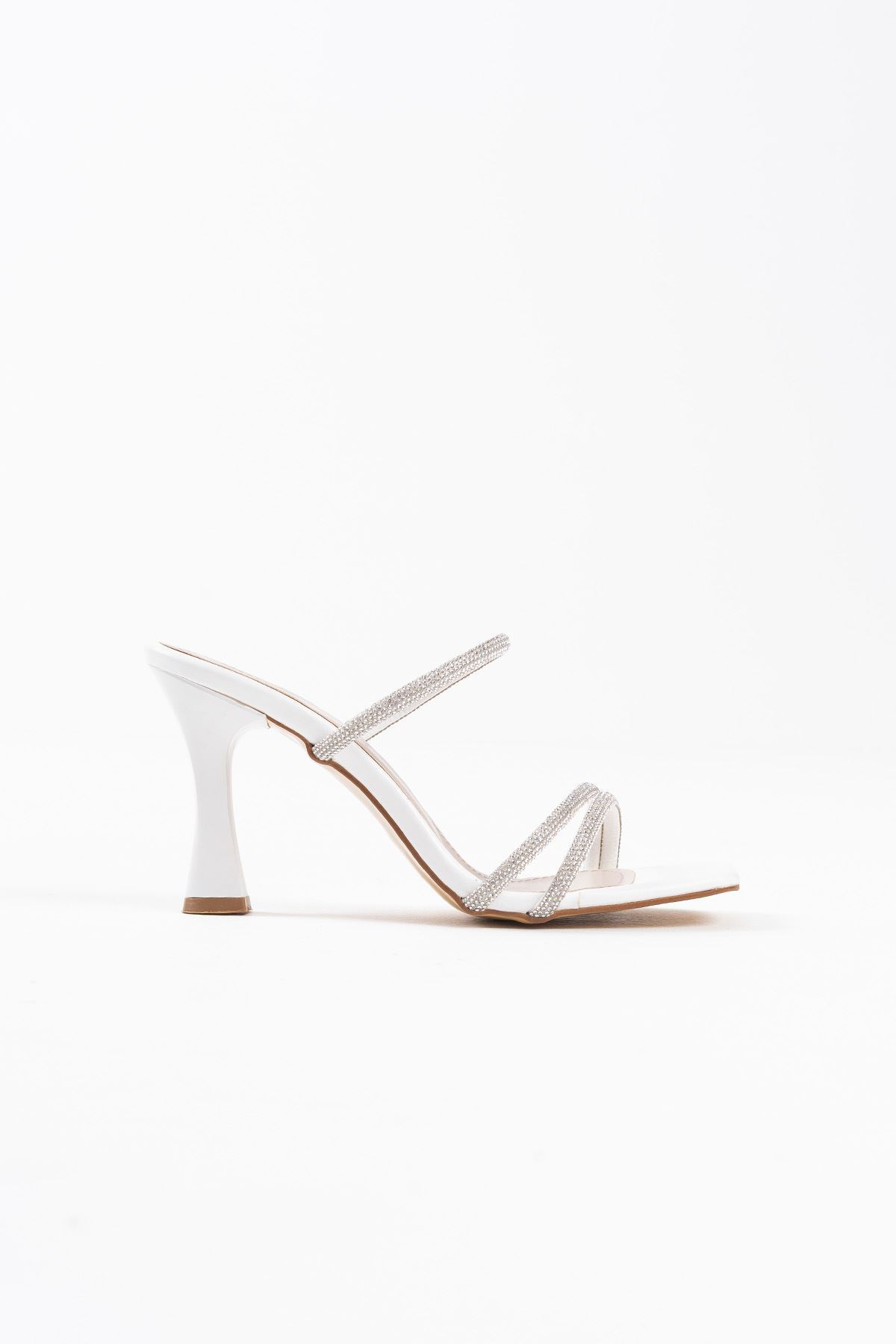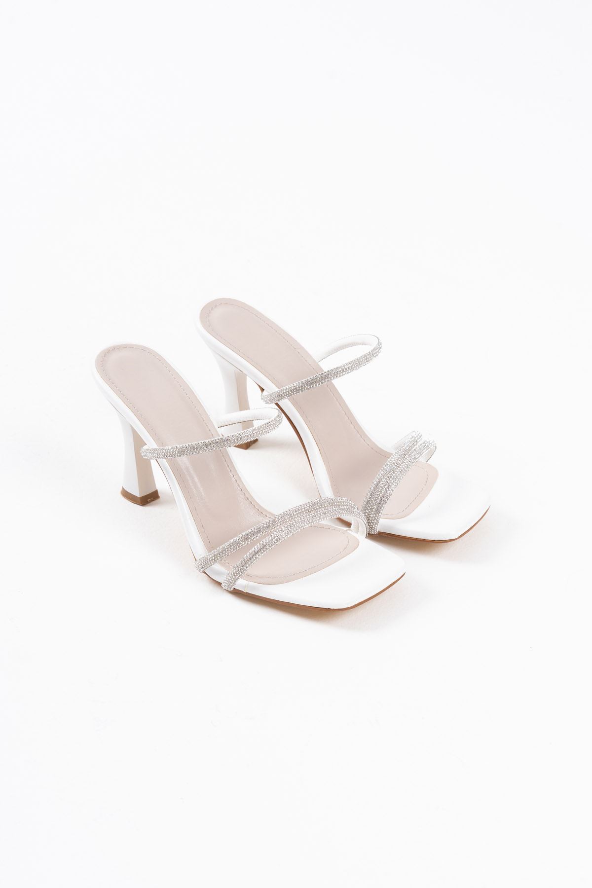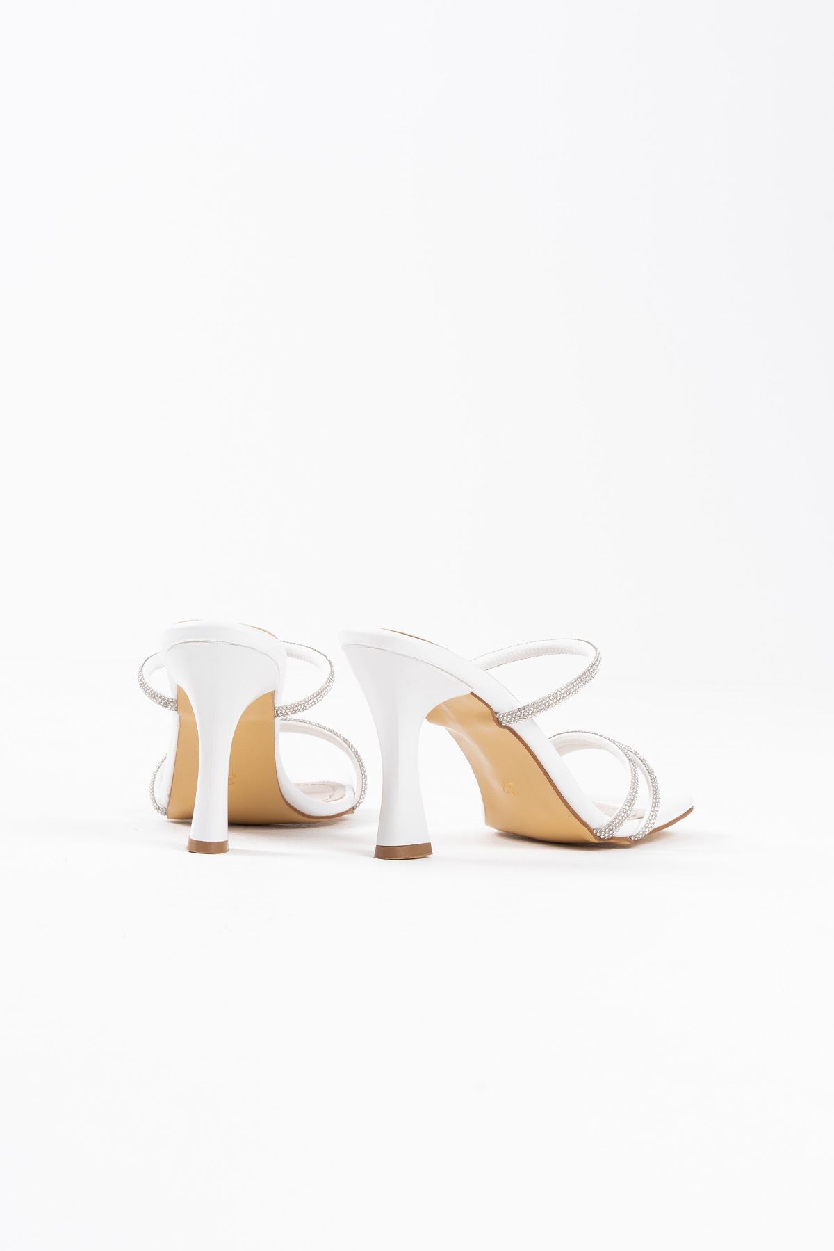 Alvina Beyaz Taşlı İnce Bantlı Kadın Topuklu Terlik