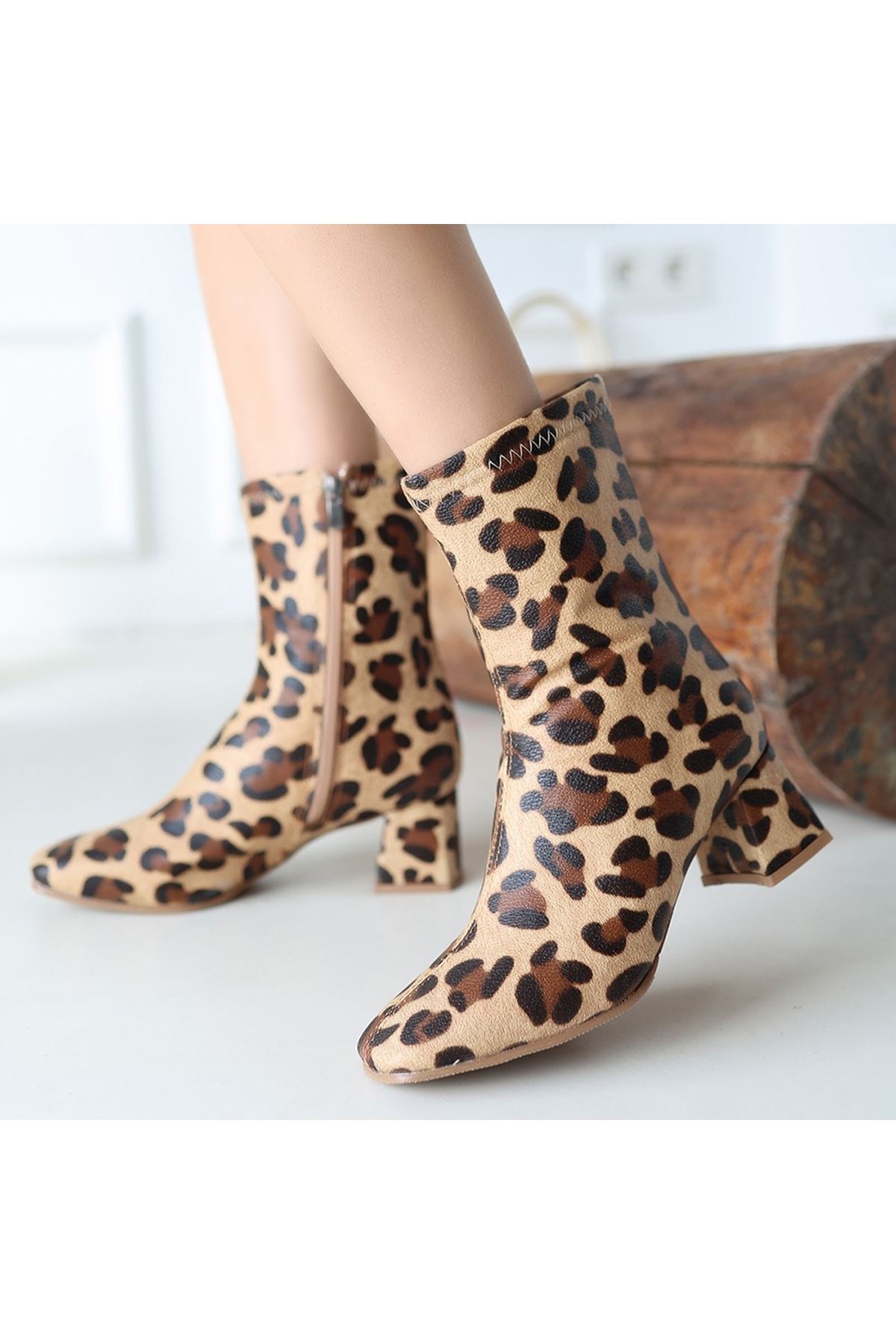 Birta Leopar Cilt Streç Topuklu Bot
