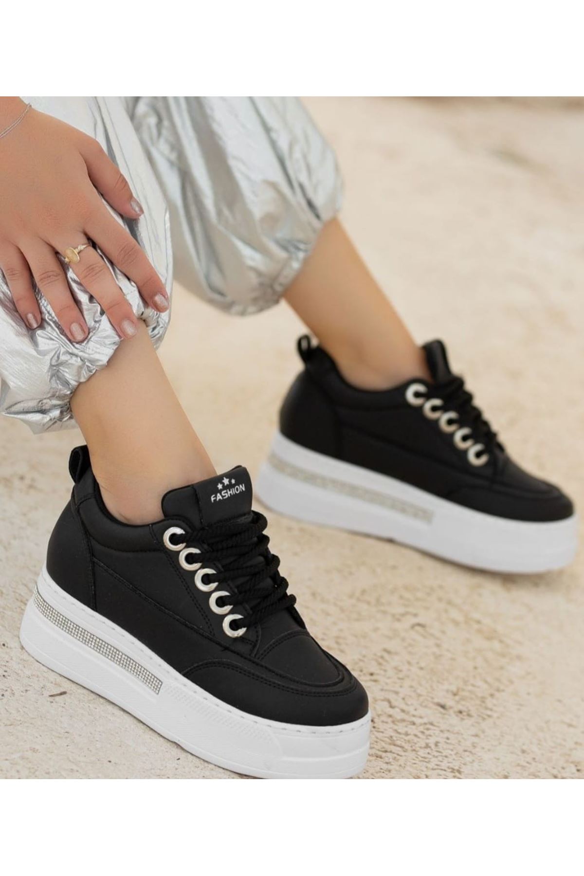 Lulu Siyah Cilt Beyaz Tabanlı Bağcıklı Spor Ayakkabı