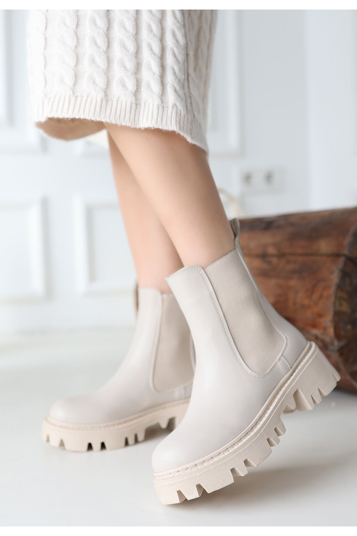 Ninle Bej Cilt Topuklu Bot