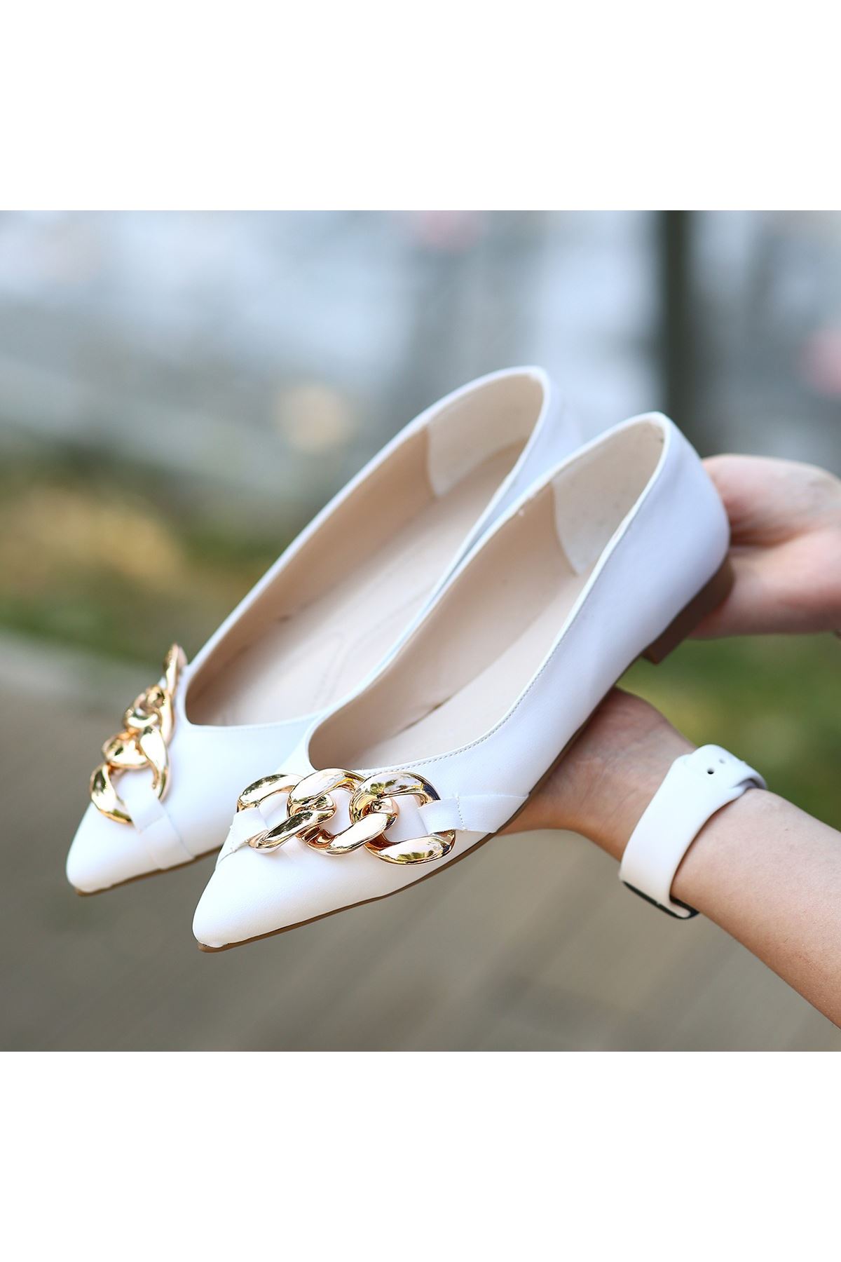 Popi Beyaz Cilt Zincirli Babet Ayakkabı