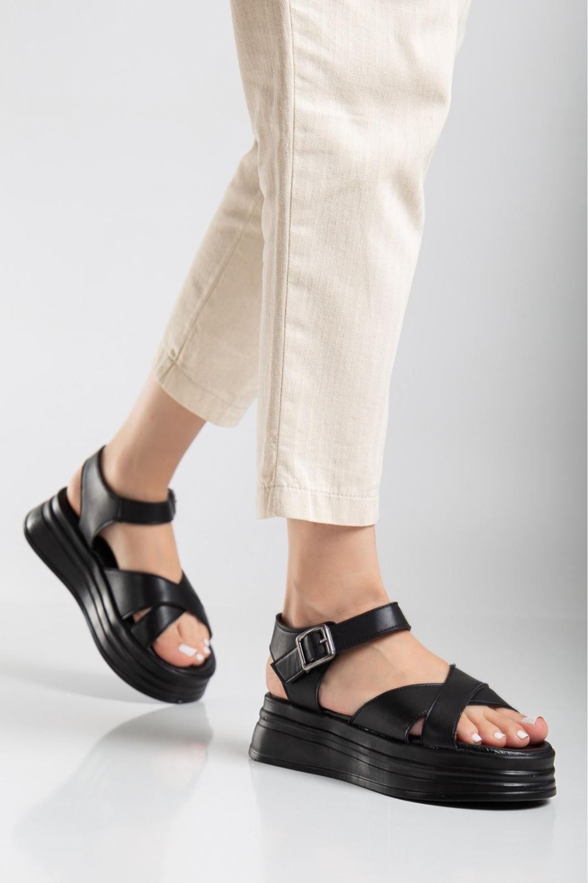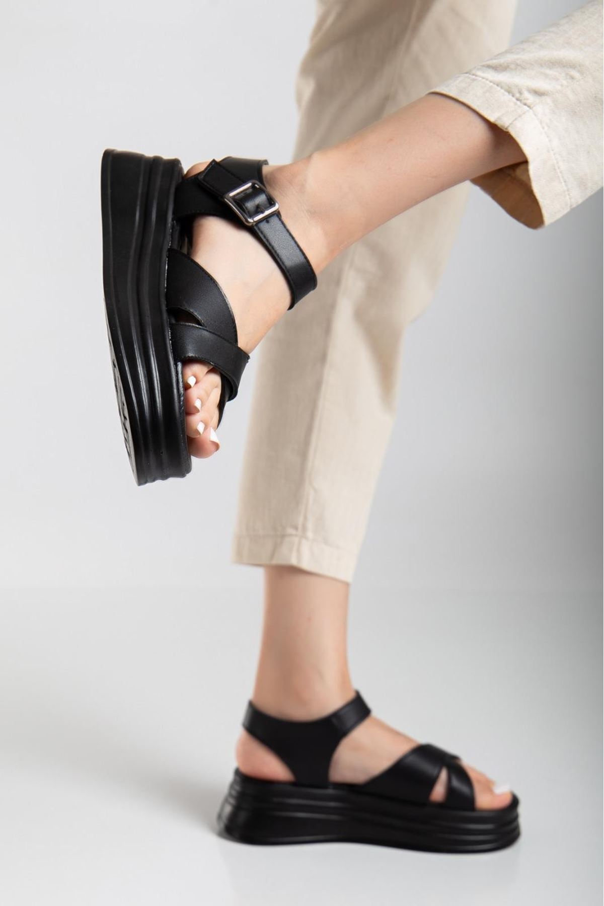 Sibna Siyah Cilt Kemerli Sandalet