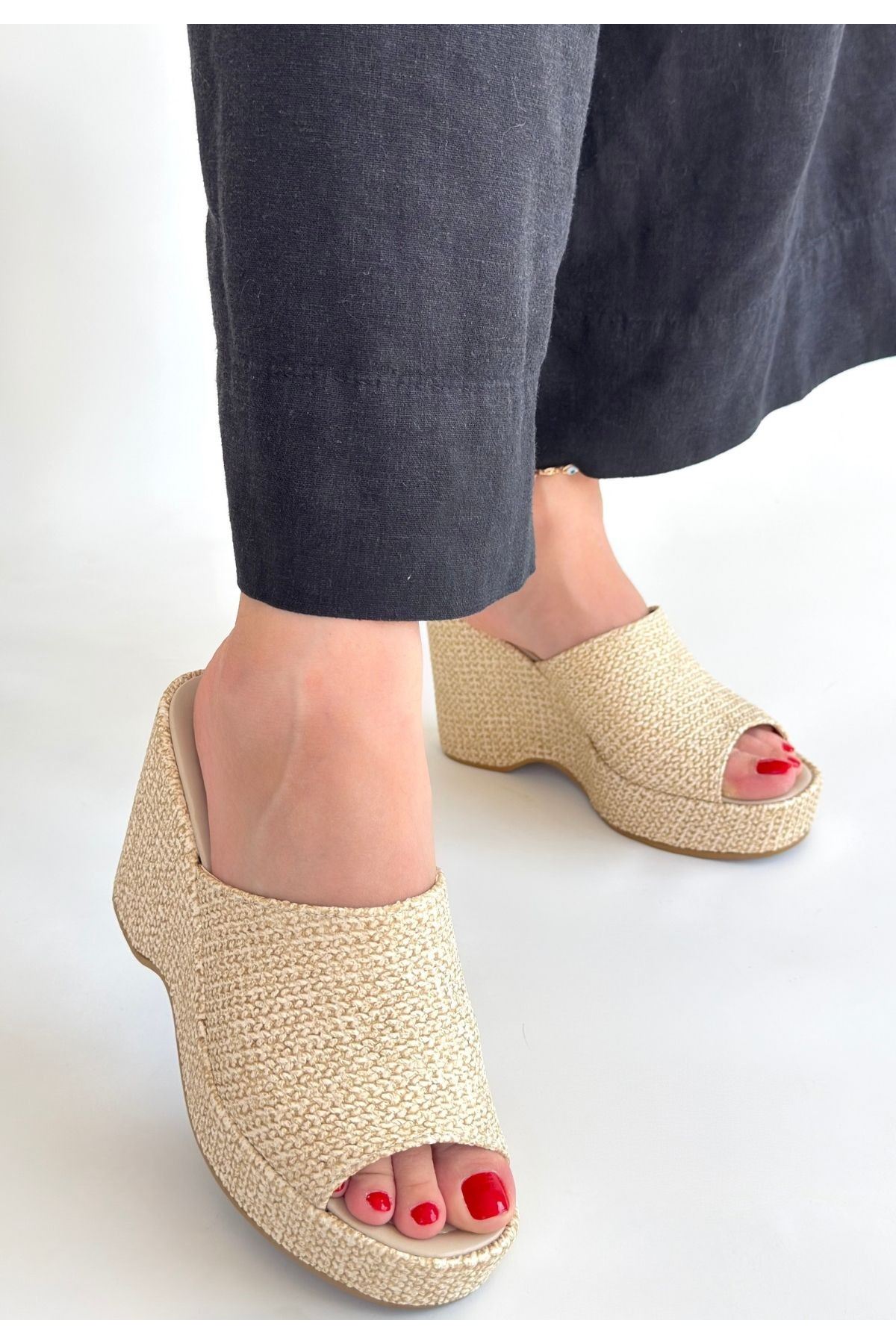 Tlay Bej Hasır Dokumalı Dolgu Topuk Terlik